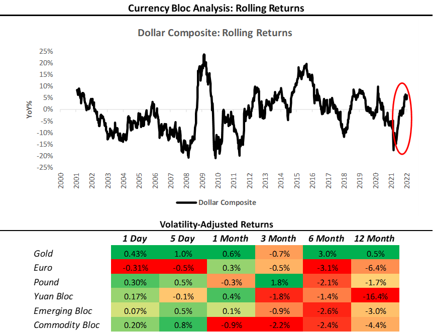 We proxy global capital flows using our Currency Bloc Monitor. The Currency Bloc Monitor aggregates FX price data from currencies that share high correlation characteristics, allowing us the gauge which area or asset in the global economy is attracting cross-border capital. The color-coding in the table reflects the strength of a Currency Bloc versus others for a given time frame. We aggregate these currencies versus the dollar and show our Dollar Composite below: