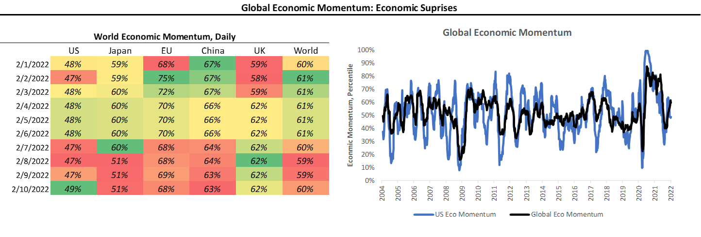 We start by tracking economic data relative to consensus expectations, as the impact of financial data on markets depends on whether its surprises the upside or downside. We standardize this data and call this indicator Economic Momentum, i.e., higher values are positive and lower values are negative. The color-coding in the table represents higher/more downward momentum for a given country: