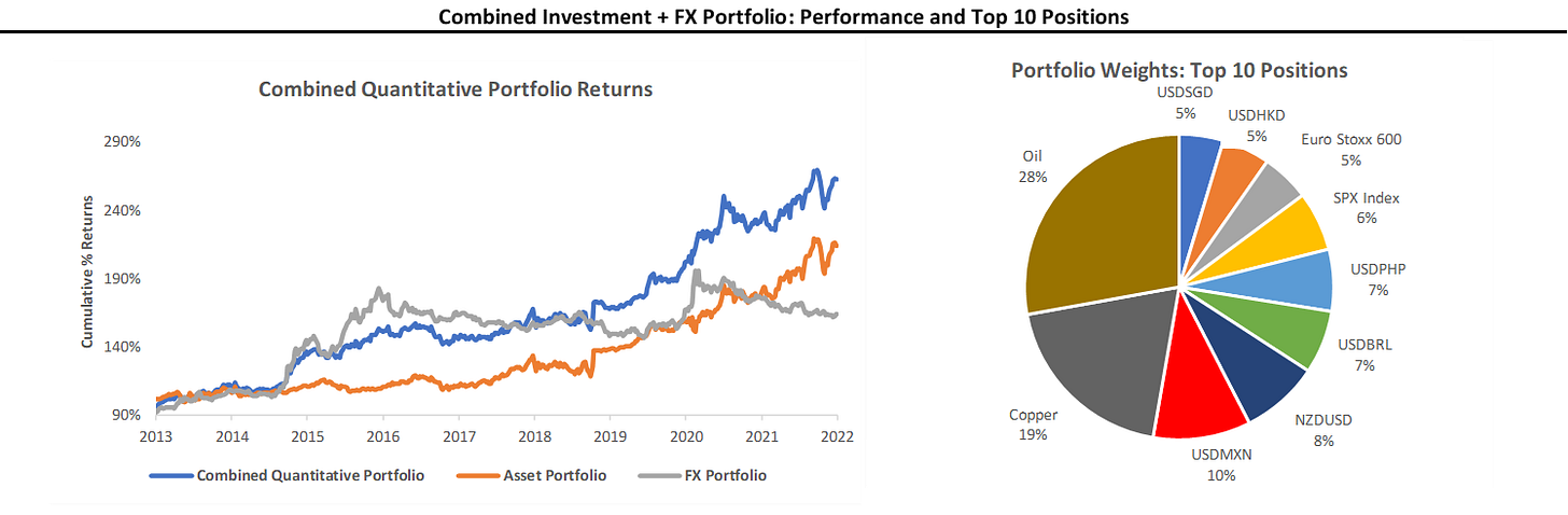 We can construct a rules-based, quantitative model portfolio using our various models to detect price trends. This portfolio uses estimates of price trends, volatility, implied volatility, and macroeconomic drivers to allocate to different assets. Below, we show its most recent allocations: