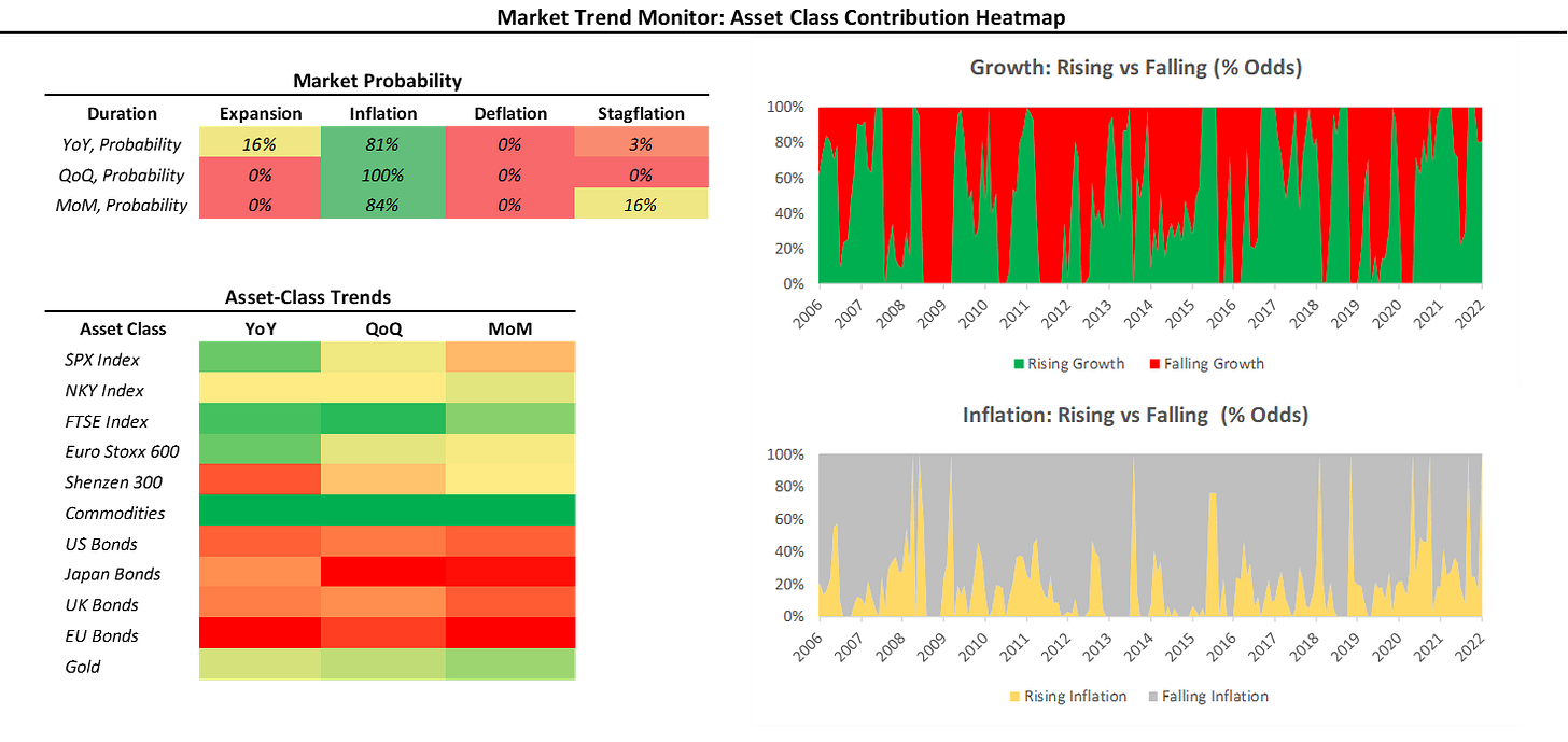 The table below shows the current market probability of the global economy experiencing expansion, inflation, deflation, or stagflation. The two charts show the odds implied by markets that economic growth is rising or falling, or inflation is rising or falling. Finally, the heatmap shows the contributions of major investment markets to these signals. There are three levels for our market probability estimates (monthly, quarterly, and yearly). We typically take the most signal from the yearly gauge and associate more informational value to higher frequency measures.